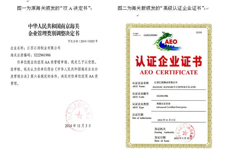 2015年7月30日,由無錫關(guān)檢貿(mào)組織的“共創(chuàng)共建”啟動儀式在無錫隆重舉行,參會企業(yè)共十五家。會議議程為原無錫市15家海關(guān)AA類管理的企業(yè)直接過渡為海關(guān)高級認證企業(yè)。江蘇江潤銅業(yè)有限公司榮獲由南京海關(guān)頒發(fā)的“高級認證企業(yè)”的稱號,公司總經(jīng)理駱偉棟參會并領(lǐng)獎。《中華人民共和國海關(guān)企業(yè)信用管理暫行辦法》去年12月1日實施后,海關(guān)注冊企業(yè)的管理類別從原來的AA、A、B、C、D類劃分,改為按企業(yè)信用狀況劃分為認證企業(yè)、一般信用企業(yè)和失信企業(yè),其中認證企業(yè)又分為一般認證企業(yè)和高級認證企業(yè)。認證企業(yè)在通關(guān)時適用較低的貨物查驗率,單證審核程序相對簡化,并可以優(yōu)先辦理海關(guān)通關(guān)手續(xù)。 高級認證企業(yè),除享有一般認證企業(yè)的通關(guān)便利外,其進出口貨物在確定商品歸類、原產(chǎn)地確定、海關(guān)估價和辦結(jié)其他海關(guān)手續(xù)前可先行驗放,由海關(guān)統(tǒng)一設立協(xié)調(diào)員,提供便捷通關(guān)服務。走出國門后,高級認證企業(yè)更可享受與中國實現(xiàn)AEO互認國家或地區(qū)海關(guān)提供的通關(guān)便利,這相當于直接獲得一張在全球有關(guān)國家或地區(qū)快速通關(guān)的VIP卡。